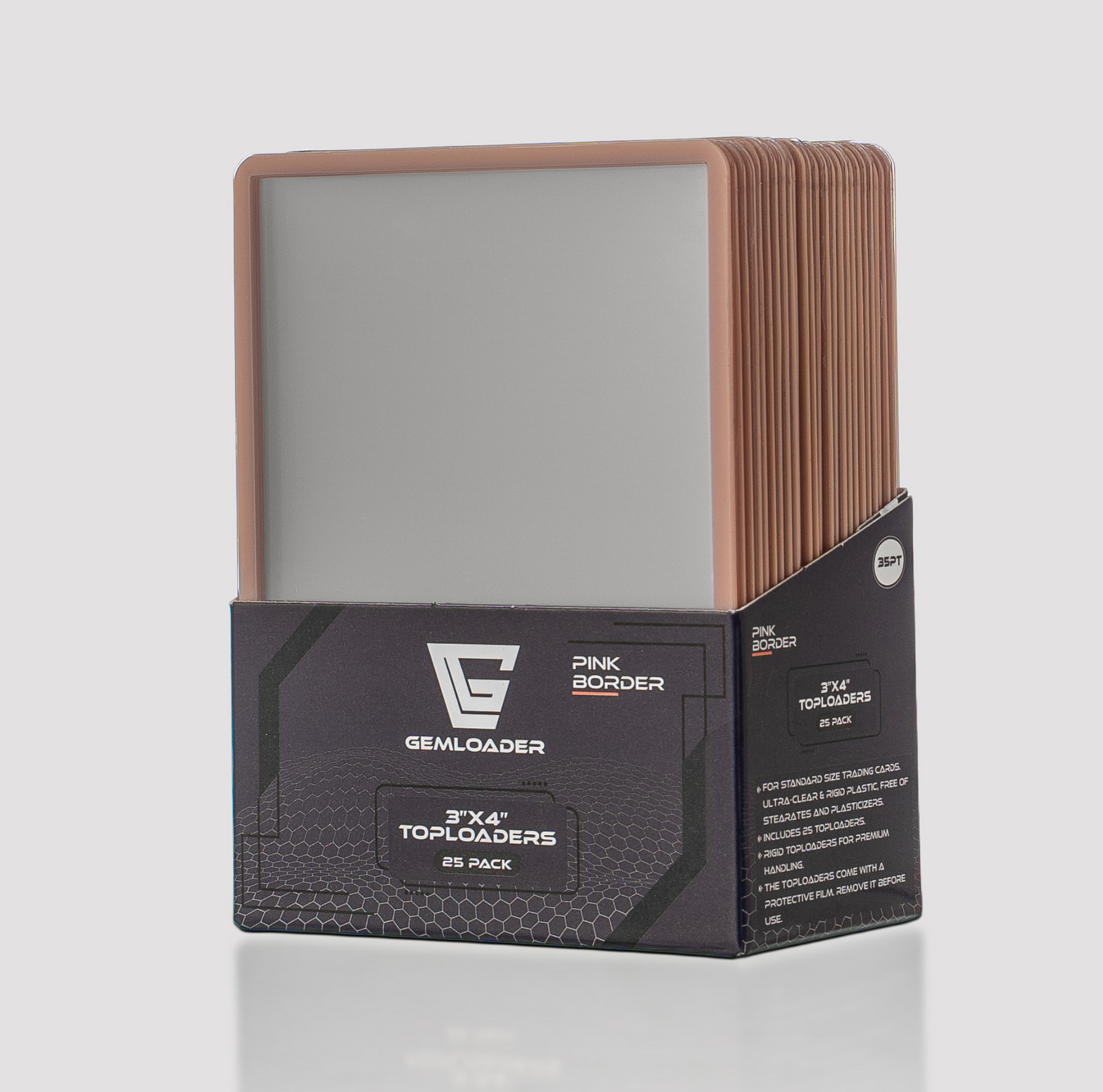 Perfect sized toploaders for the Gemloader toploader binders! Suitable for standard size cards of 63.5 x 88.9 mm Suitable for cards up to 35pt thickness Ultra-clear and durable construction RigidPVC, containing no plasticizers or stearates. Without any doubt the best toploaders available!